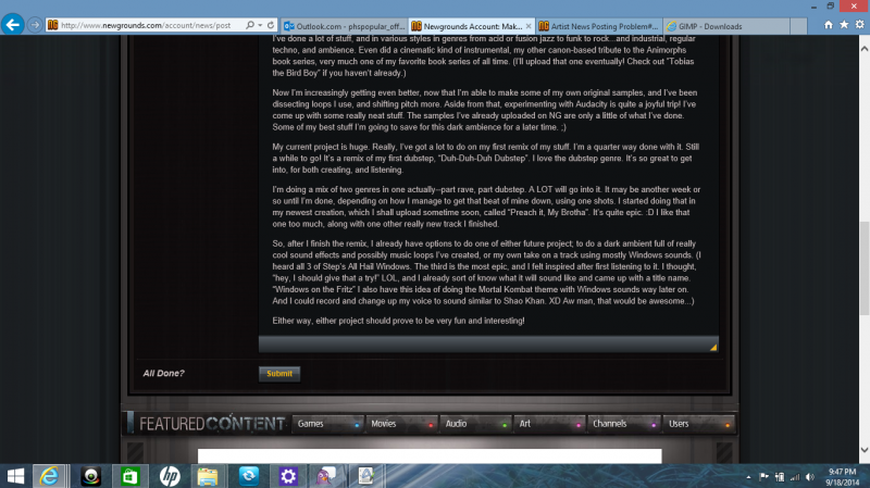 Damn it, wrong image in the second hyper link. Here's the correct one, of everything seeming normal near the Submit button: http://img.photobucket.com/albums/v675/talonknowsbest/For%20NG%20News%20Post%20Problem/NGNewspostpage_zpsbc2f3b05.png