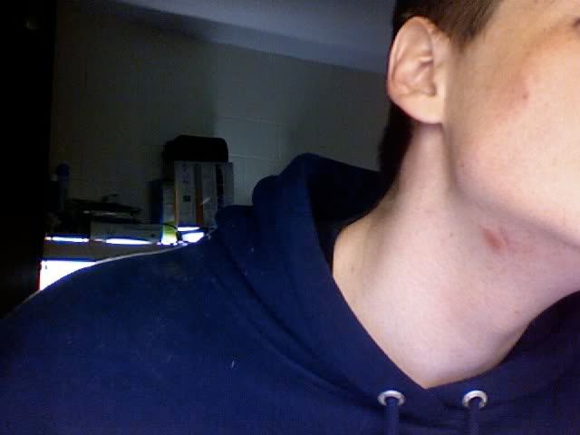 Here's one just now, but it's kind of difficult to see the bruising in this lighting (it's from the top of my eye down to my chin almost). All I have to take pics now is my roommates Mac and it's pretty dark in here. I'm just now sort of sobering up from tonight and getting ready for bed.
