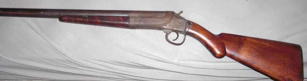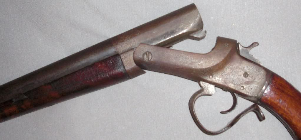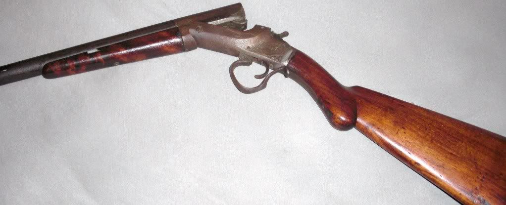 I've postulated that this is, indeed, a shotgun, as there is a distinct lack of rifling inside the barrel, and also it is a break action weapon. However, I've no idea what make, or model this weapon is, if any.