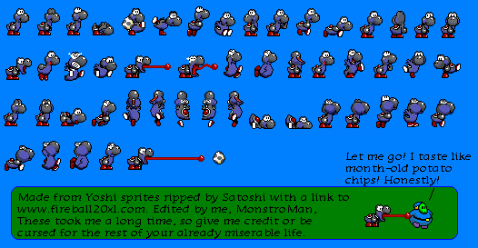 Hello. I've just recently started editing sprites (editing, since all my very few attempts at custom sprites have failed so very horribly) with MS Paint. Paint isn't actually too bad for editing sprites; I've started with some recolourings but am slowly going to work my way up. Here's one of my things, Demon yoshi. I chqanged the colout of his shoes, shell, skin and stomach and removed the spines on his back.