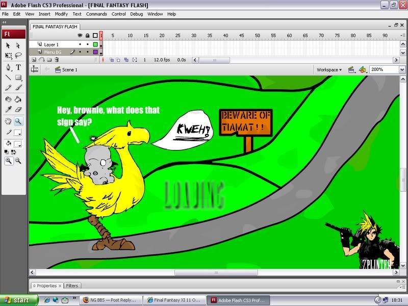 this is a quick screenie of my latest flash project, which inncidently is the first thing I've started in flash for god knows how long. it's a Final Fantasy 12 tribute type thing, which will basically involve taking the piss out of it, even though I love this game :)